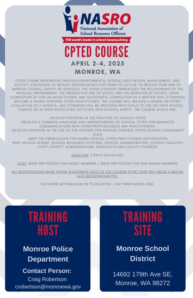 Monroe School District will host the National Association of School Resource Officers (NASRO) in April for a training on Crime Prevention Through Environmental Design (CPTED).