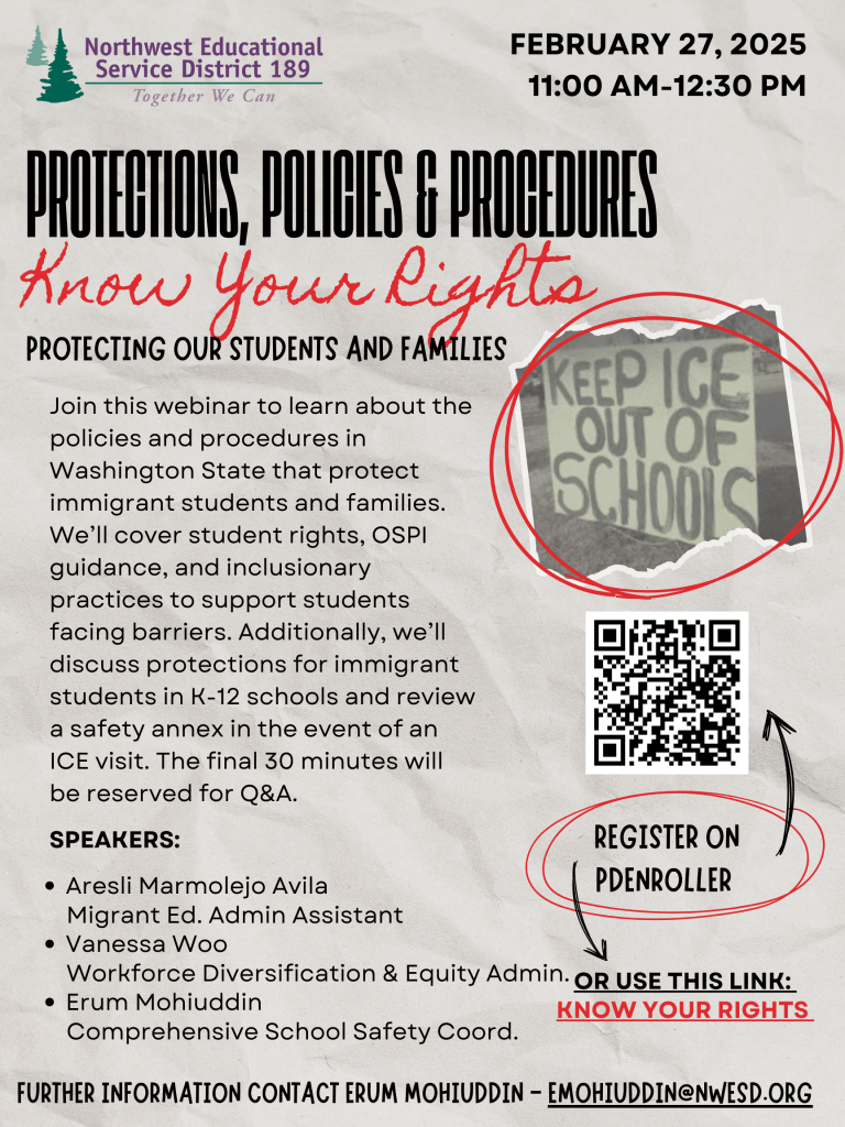 The NWESD 189 is hosting a free webinar for school leaders and staff titled “Protections, Policies & Procedures: Know Your Rights, Protecting Our Students and Families.” This session will provide an overview of Washington State policies and procedures designed to safeguard students and their families.