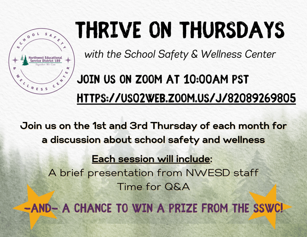 Join us TODAY, Thursday, June 5, for the last THRIVE ON THURSDAY of the 2024-25 school year. Since February, the School Safety and Wellness Center has hosted a one-hour opportunity for educators, staff, and safety partners to join us for news and updates about some of the most pressing school safety & wellness topics.