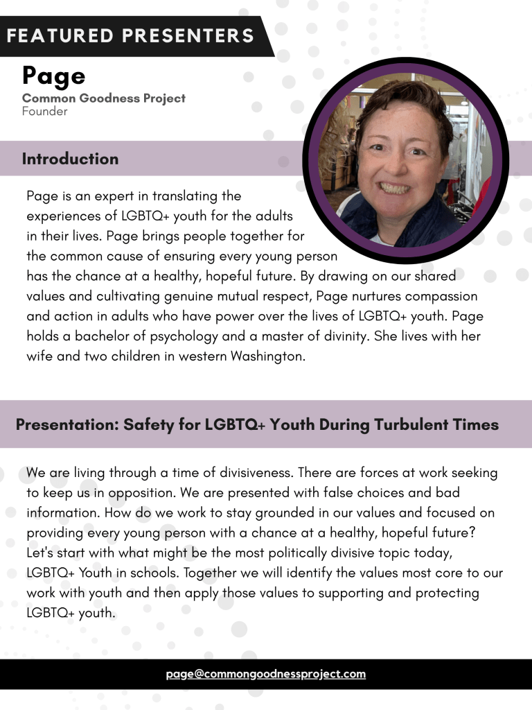 With a background in psychology and a Master of Divinity, Page weaves together both head and heart. Drawing on her deep well of experience – and life as a parent and spouse in Western Washington – Page guides adults in positions of power toward empathy-driven, values-based action. Whether you’re a teacher, school leader, counselor, first responder, or community partner, Page reminds us that the work of supporting LGBTQ+ youth isn’t about politics – it’s about people.