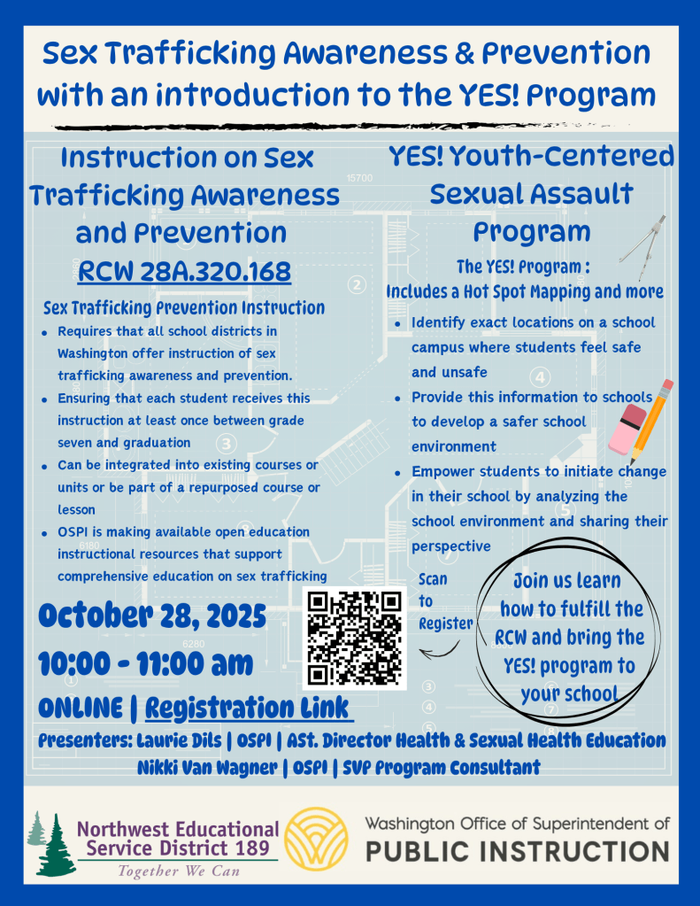 Join us and our partners from OSPI on Tuesday, October 28, 10:00–11:00 a.m. on Zoom for an essential conversation on RCW 28A.320.168 and Sex Trafficking Prevention Instruction in schools.