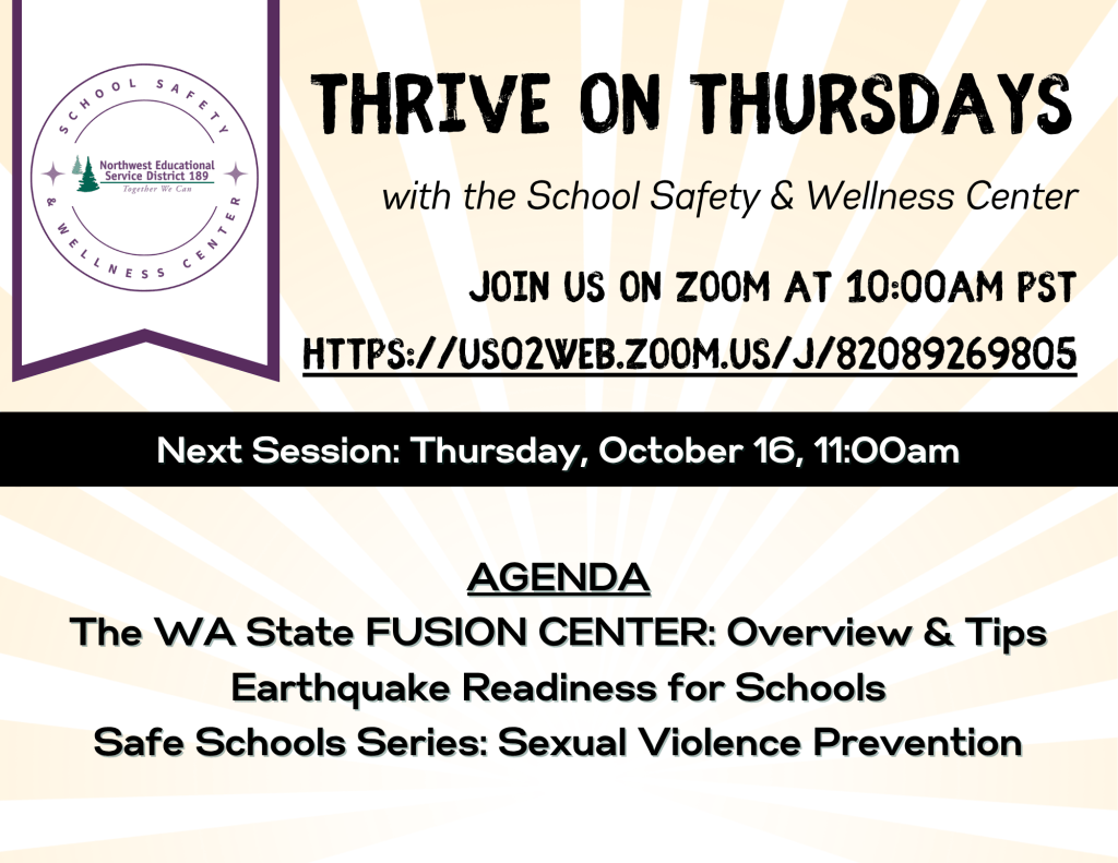 Immediately following the ShakeOut, join us at 11:00 AM on Zoom for Thrive on Thursday. This session will be led by our School Safety Coordinator, Erum Mohiuddin, who will share with us about the WA State Fusion Center, and our roles and responsibilities as educational partners with them.