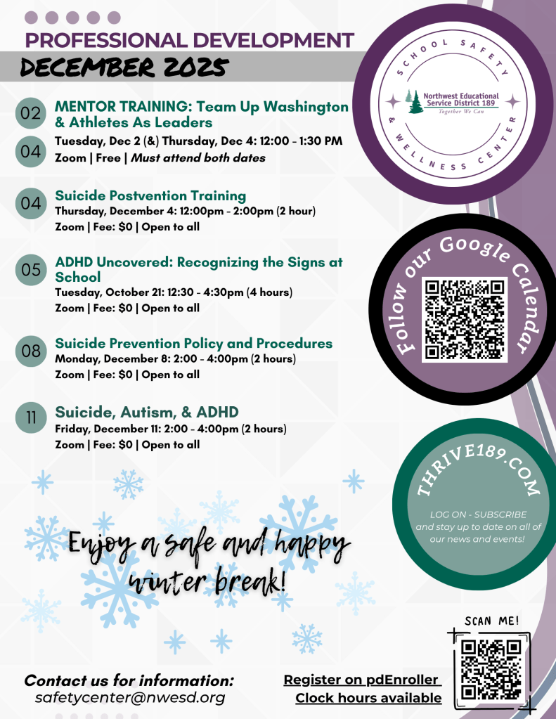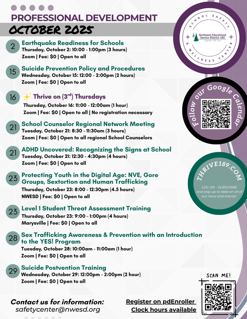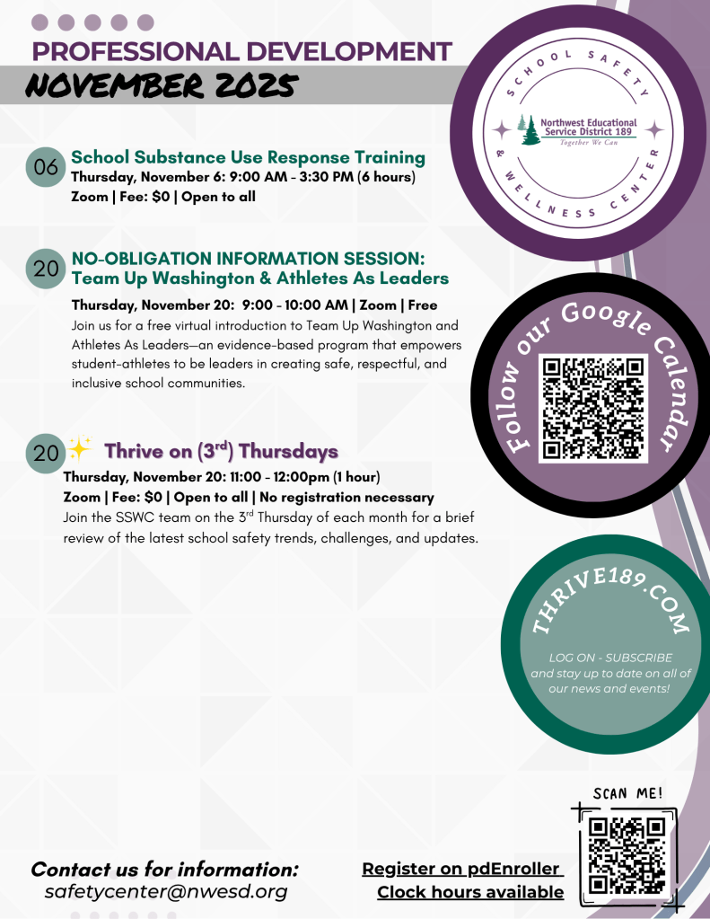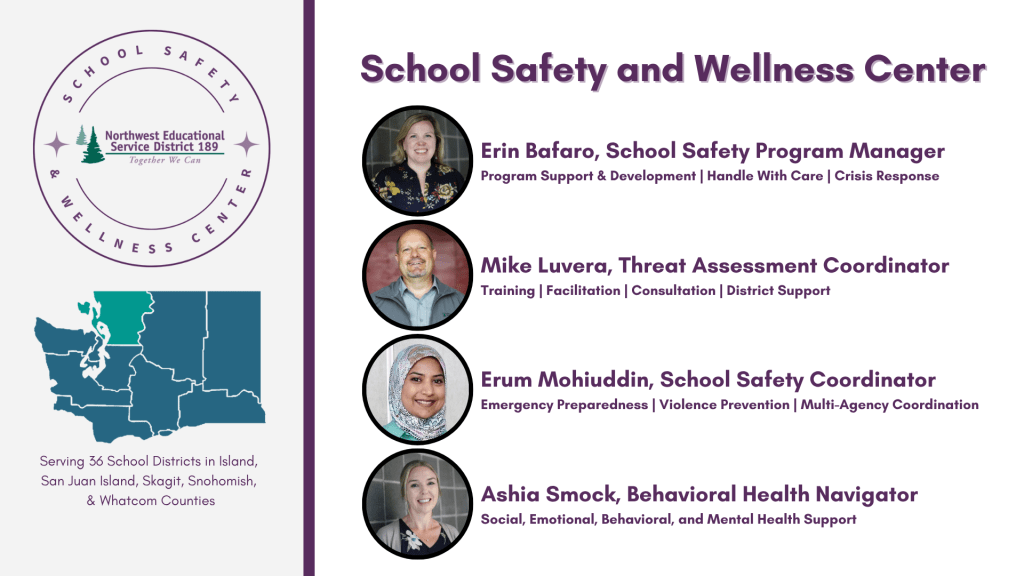 Here at NWESD 189’s School Safety and Wellness Center, safety isn’t just a week-long focus—it’s a year-round commitment. We are proud to partner with school districts across Northwest Washington to provide training, technical assistance, and resources that strengthen threat assessment teams, improve behavioral health supports, and enhance emergency preparedness.