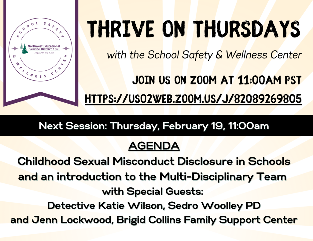 We’re glad you asked! Each month, on the third Thursday, the NWESD School Safety and Wellness Center hosts a short, informal Zoom session where we share regional updates, timely school safety topics, and resources of interest. These sessions are open to everyone—no registration, no cost, and no obligation. Simply log in and join the conversation. We’d love to have you with us.