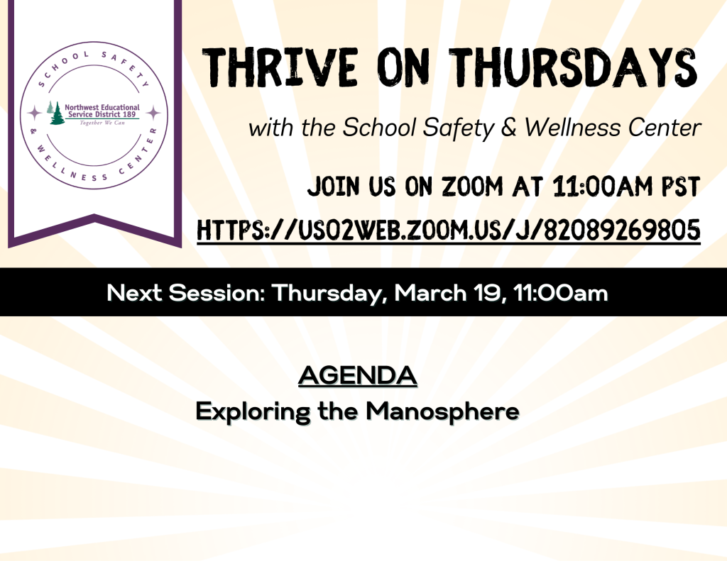 We invite you to learn more about the manosphere by joining us on Thursday, March 19th at 11:00am (Zoom). During this session of our monthly office hours, Thrive on (3rd) Thursdays, Erum Mohiuddin will share more about the online network and foster discussion about its impact on our students. No registration is necessary – just log on and learn with us!